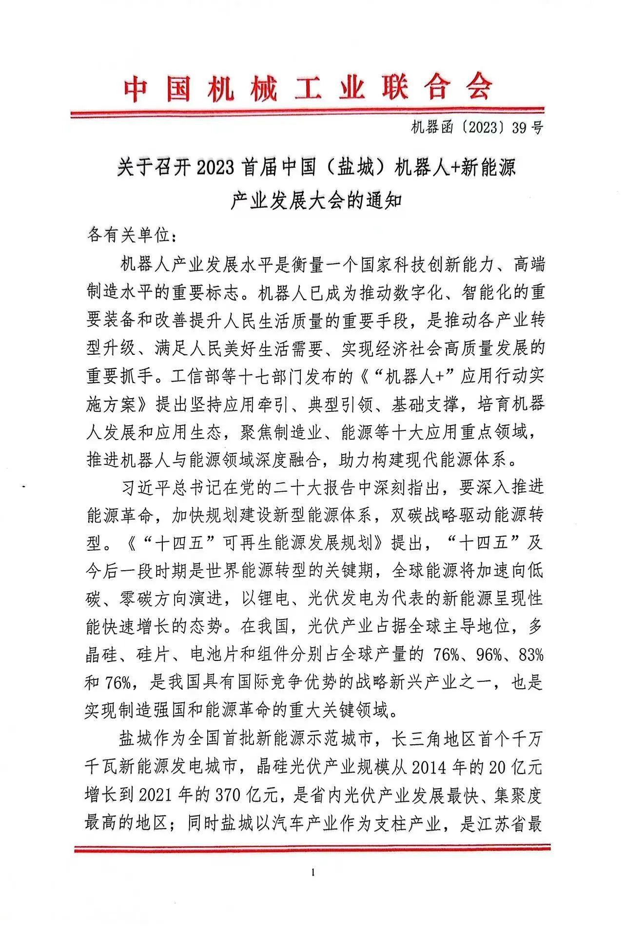 关于召开2023首届中国(盐城)机器人+新能源产业发展大会的通知